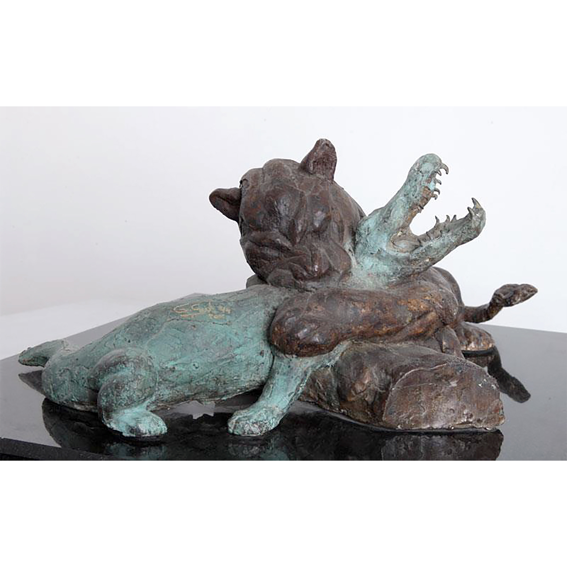 “La película que escogí del cine colombiano cuyo tema tiene relación con mi obra es ́ ́Magia salvaje ́ ́. Tema que se ha manifestado no solo por el amor que algunos artistas y creativos tenemos por los animales, sino como una premonición de como los entes gubernamentales actuales están tomando medidas que posibilitarían frenar la devastación y destrucción del medio ambiente, el clima y la contaminación del planeta. Medidas que en estos días posibilitan un revertimiento de la destrucción del planeta, tales como la restricción del uso de bolsas plásticas, el desarrollo de Tecnologías limpias como lo es el carro eléctrico que posibilitarían un logro que para el tiempo en el que se hizo mi obra o en el que se realizó la película eran impensables. La escena en la que se desarrolla la obra es un manglar de la selva amazónica donde un jaguar caza una babilla. Para la realización de la obra se escogió una foto principal que corresponde a la escena y se recreó con otra foto que permitió capturar la mordida con la que el jaguar estrangula a la babilla. Ojalá que las ansias de poder y riqueza de algunas personas y gobiernos permitieran que la industrialización y el desarrollo tecnológico pudieran viabilizar una relación armónica con nuestro medio ambiente. No es que yo esté en contra de los grandes logros que ha alcanzado la vida moderna, sino que considero inconcebible que no se tenga conciencia que el milagro de la vida y de la creación.”